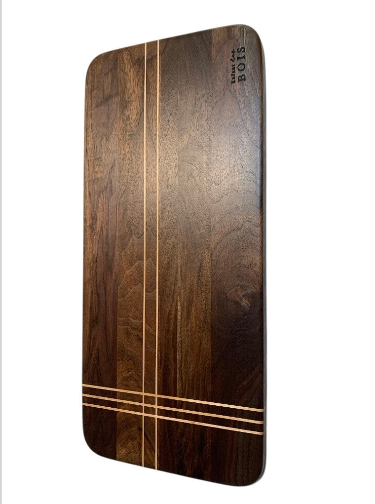 Noyer avec insertions. Chaque pièce est unique, la planche pourrait différer quelque peu de l'image (couleur des insertion de bois, etc.).