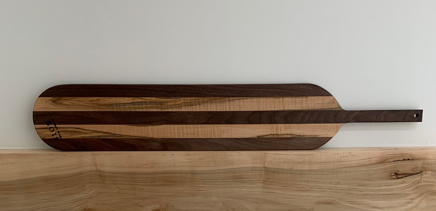 Érable et noyer. Chaque pièce est unique, la planche pourrait différer quelque peu de l'image (couleur, insertion de bois, etc.).