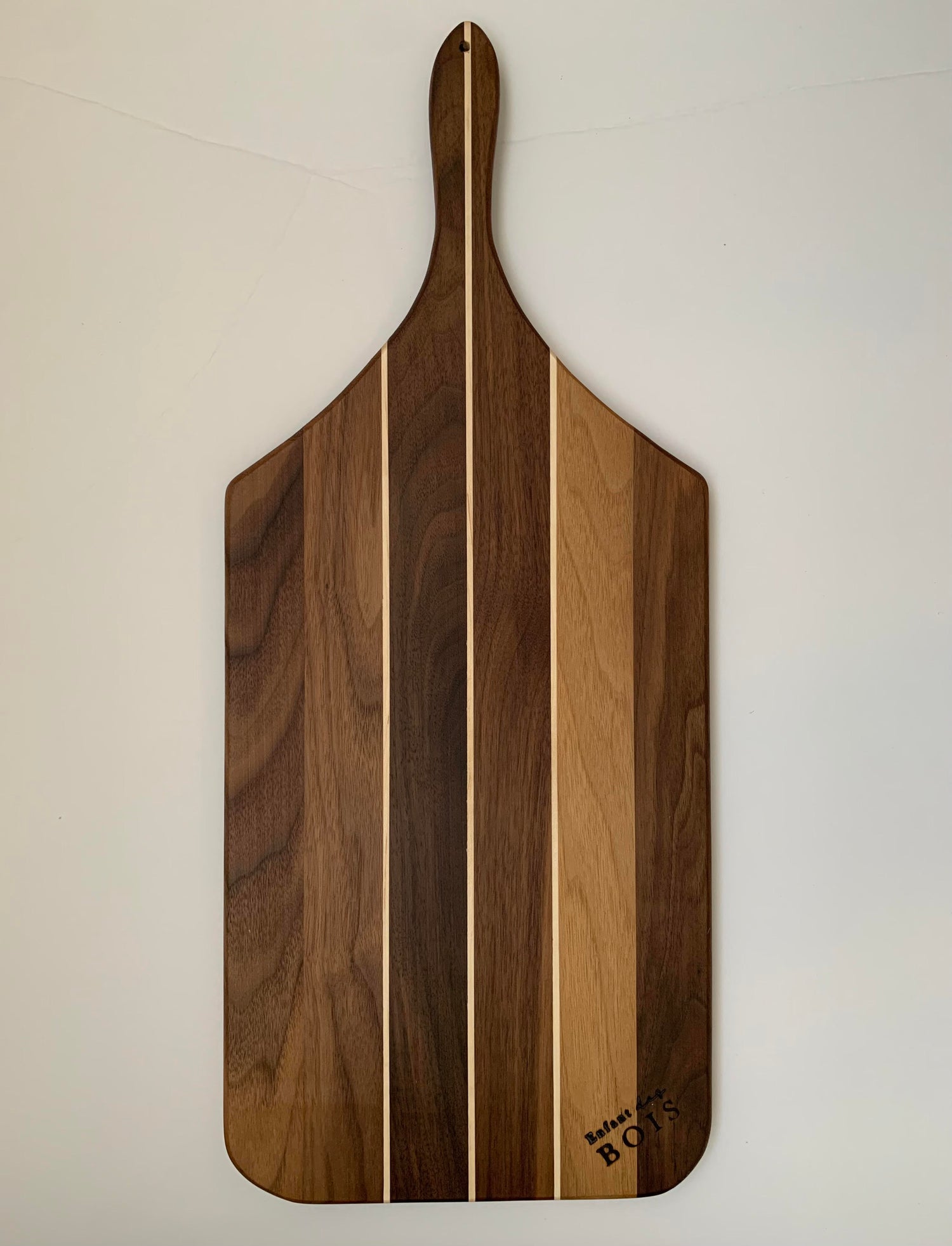 Noyer (insertions érable). Chaque pièce est unique, la planche pourrait différer quelque peu de l'image (couleur, insertion de bois, etc.).