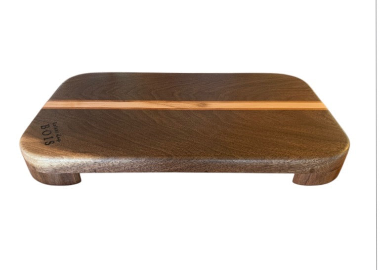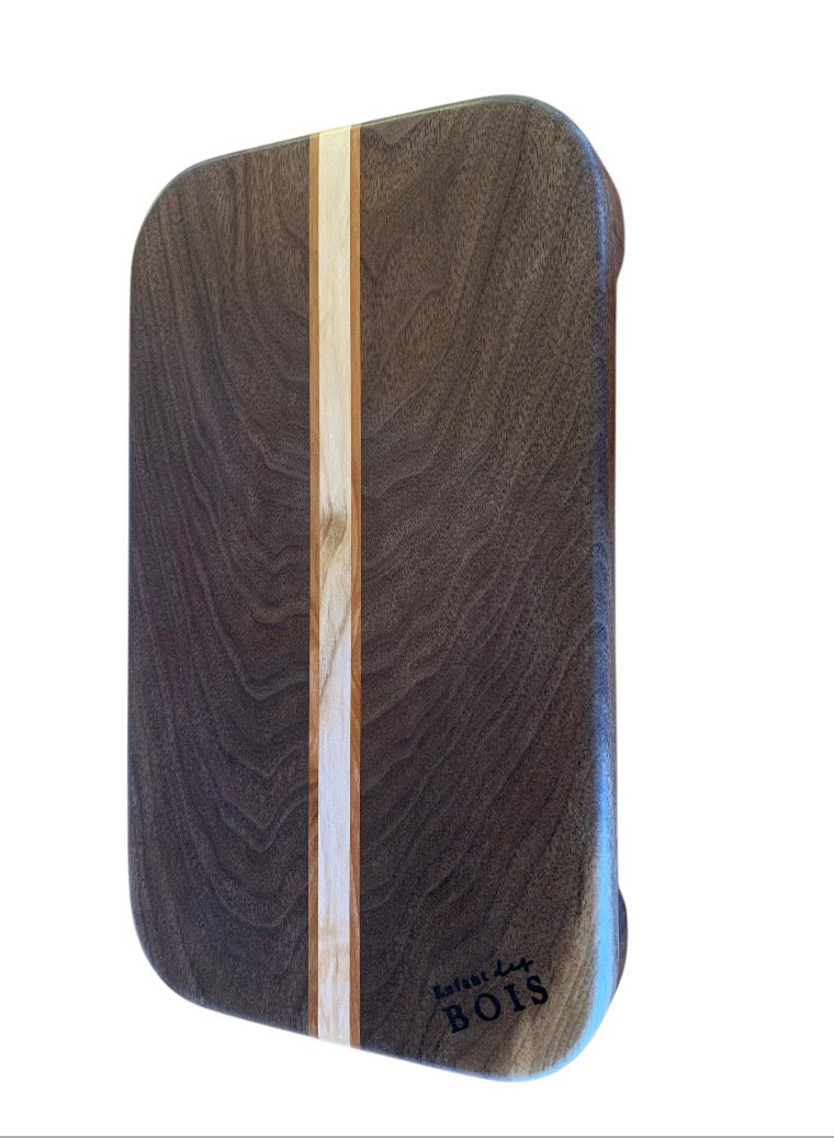 Noyer (insertions érable et cerisier). Chaque pièce est unique, la planche pourrait différer quelque peu de l'image (couleur, insertion de bois, etc.).